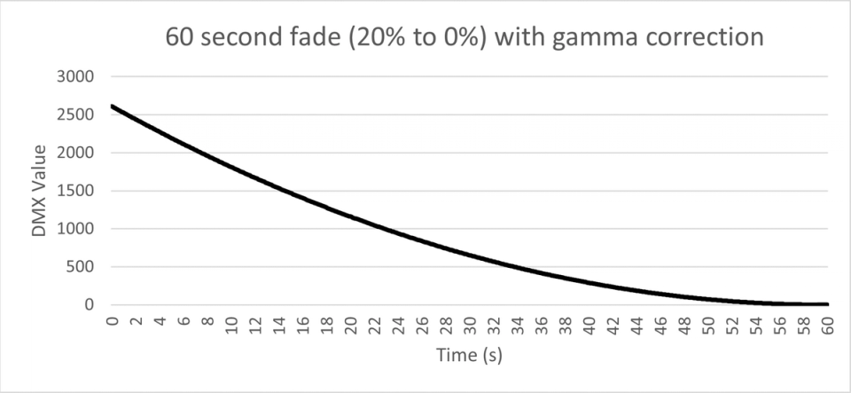 In our first example of a 60 second fade from 20% white to 0%, you can now see the curve is much smoother, as there are more DMX values available to be used.